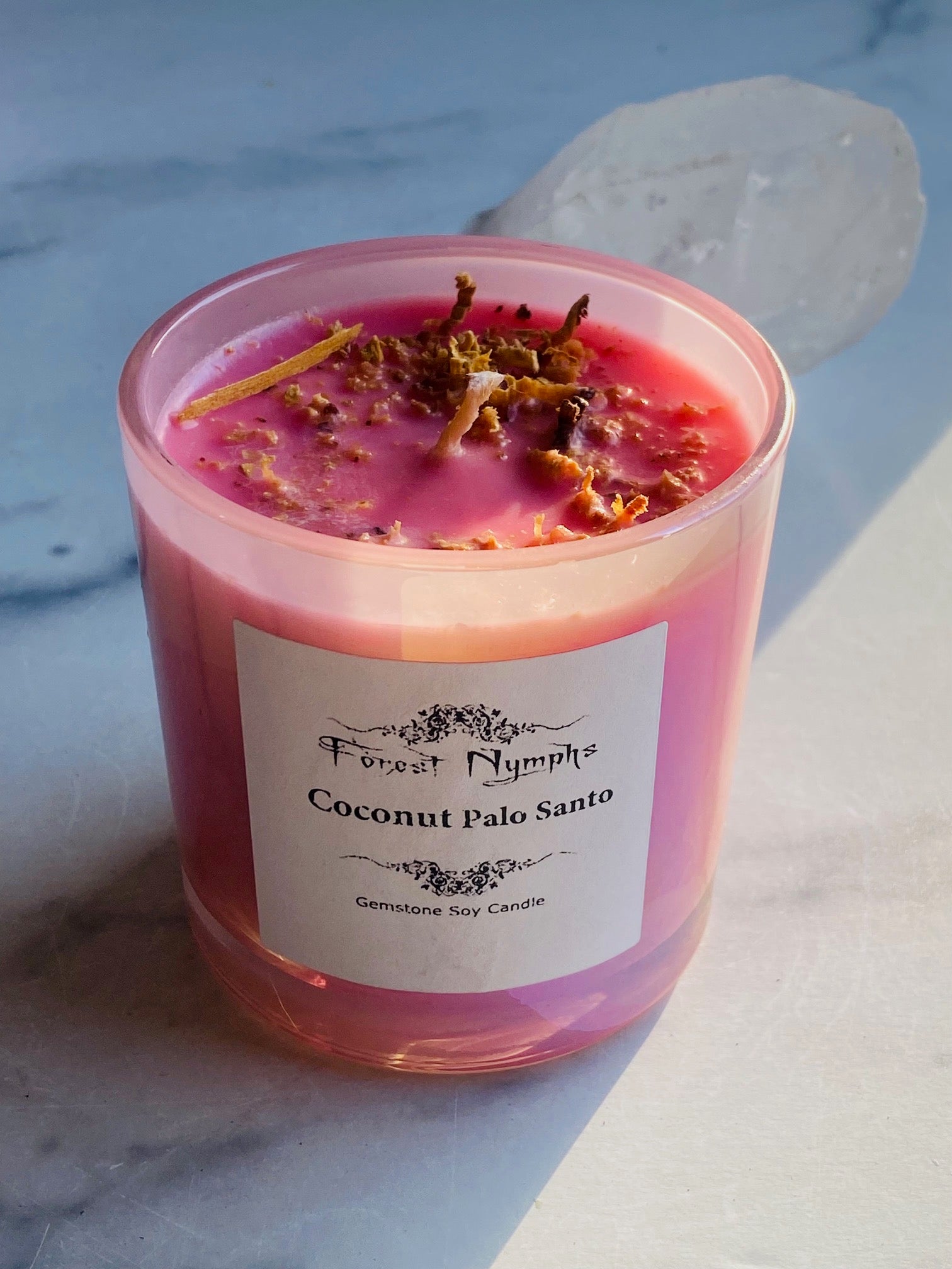 NON GMO Soy wax, Coconut, Palo Santo Phthalate free fragrance, essential oils, hemp wick, Reiki and gemstone charged